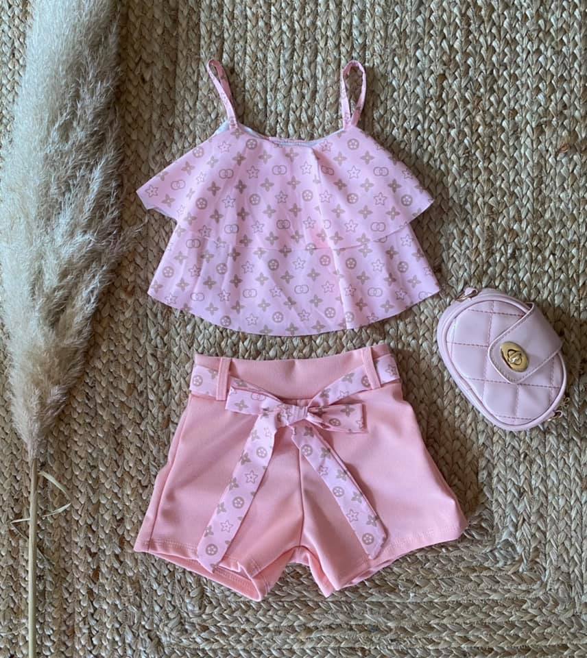 Bel ensemble rose pour fille, composé d’un haut logo à bretelles et d’un short taille élastique avec ceinture rappel logo.